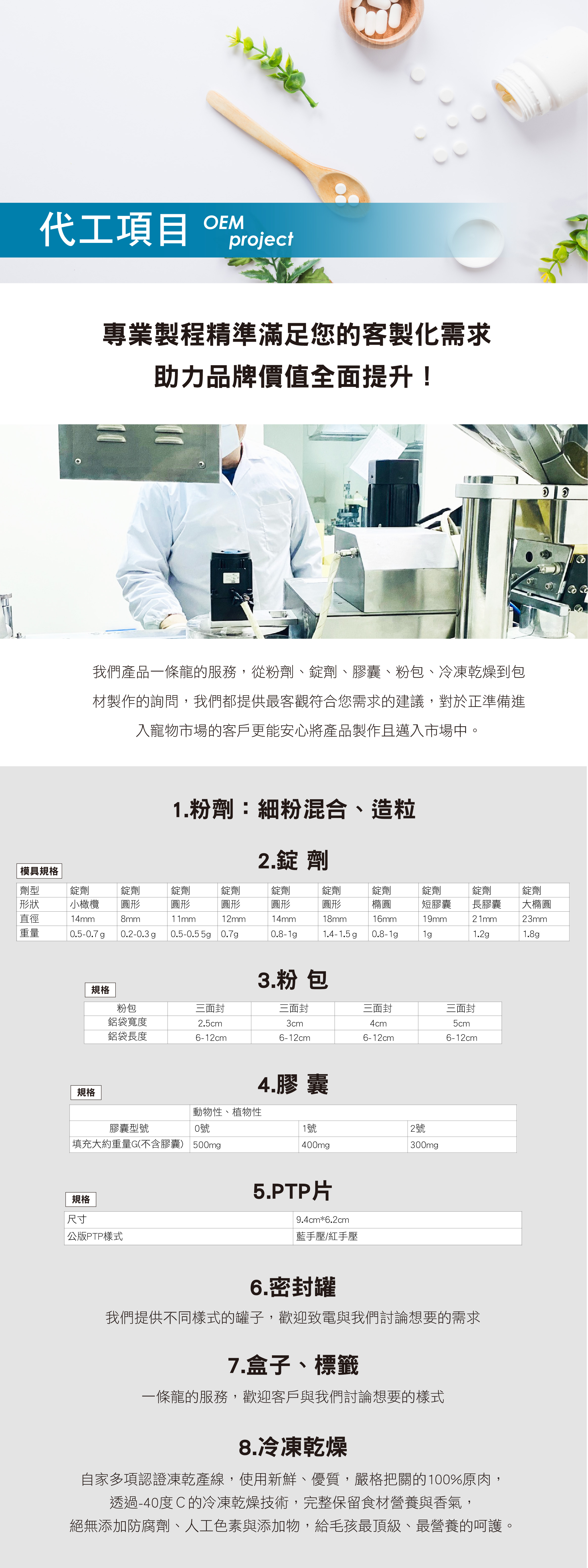 18年保健食品經驗,針對客務需求,提供客戶有效建議,開發屬於客戶的獨特商品 專業代工角色,了解寵物市場的動向,與客戶開發符合市場高品質的產品